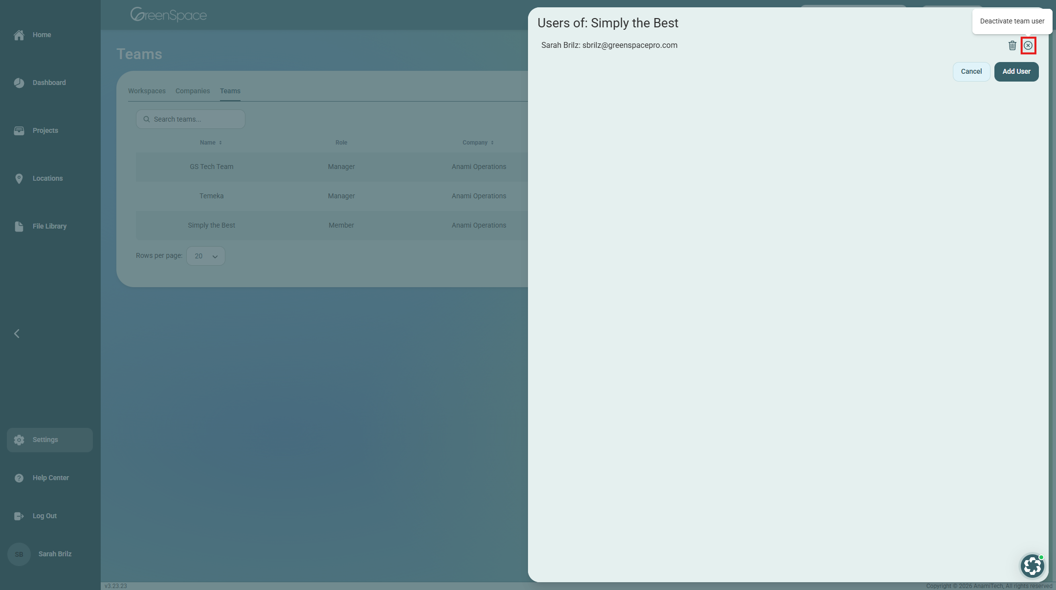 Find the user you would like to deactivate and click the circle with an X (Deactivate Team Member) button. The user’s name will appear crossed out meaning they are no longer active on the Team.
