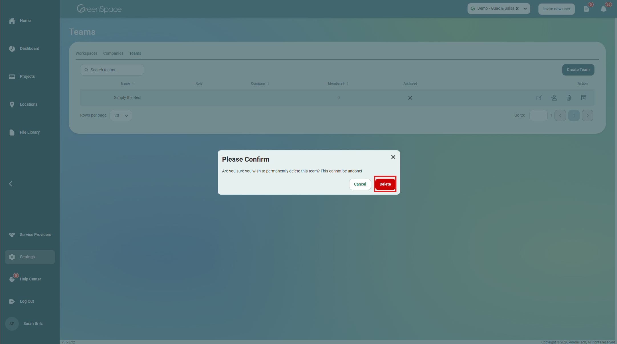 When the confirmation box pops up, click “Delete.” The Team will be permanently removed and cannot be undone.